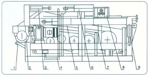 其中:1、刮泥系統(tǒng);2、傳動(dòng)系統(tǒng);3、上糾偏系統(tǒng);4、沖洗系統(tǒng);5、下張緊系統(tǒng);6、上張緊系統(tǒng);7、急??刂?;8、氣控箱;9、下糾偏系統(tǒng)。