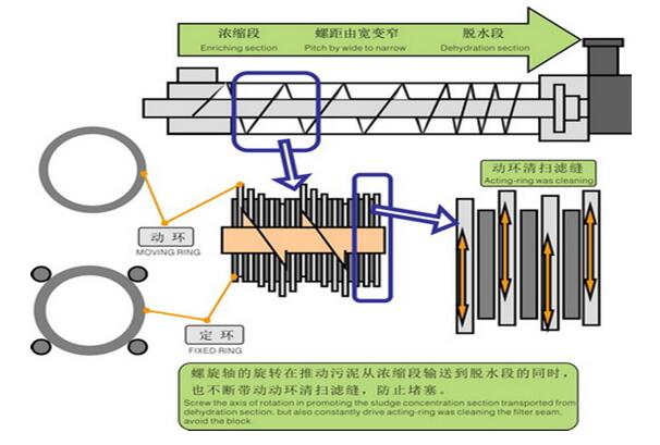 1、脫水機(jī)的主體是由固定環(huán)和游動環(huán)相互層疊,螺旋軸貫穿其中形成的過濾裝置.前段為濃縮部,后段為脫水部。