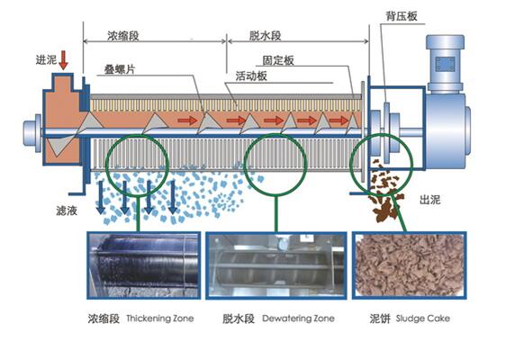 2、脫水:經(jīng)過濃縮的污泥隨著螺旋軸的轉(zhuǎn)動不斷往前移動;沿泥餅出口方向,螺旋軸的螺距逐漸變小,環(huán)與環(huán)之間的間隙也逐漸變小,螺旋腔的體積不斷收縮;在出口處背壓板的作用下,內(nèi)壓逐漸增強(qiáng),在螺旋推動軸依次連續(xù)運(yùn)轉(zhuǎn)推動下,污泥中的水分受擠壓排出,濾餅含固量不斷升高,最終實現(xiàn)污泥的連續(xù)脫水。