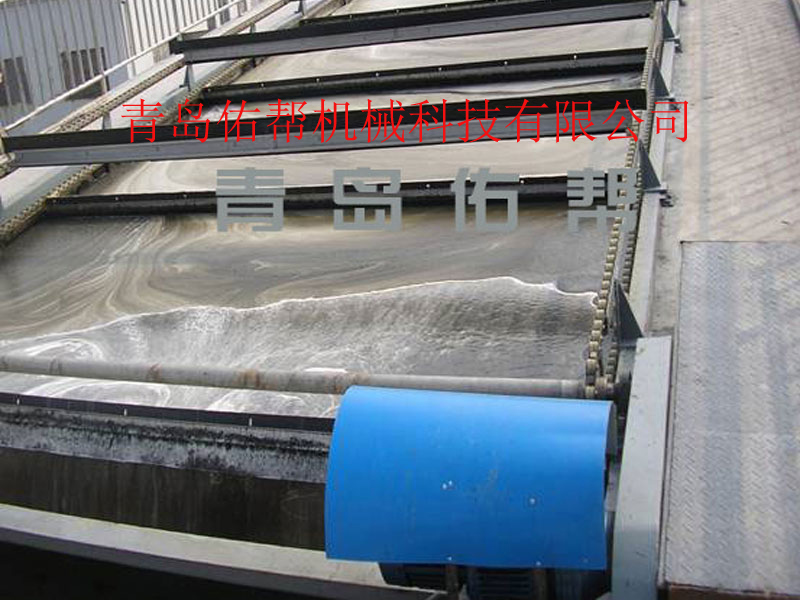 鏈板式刮油刮泥機設(shè)有兩條平行封閉的牽引鏈條,上面裝有多塊刮板,在驅(qū)動裝置的帶動牽引下,刮板沿沉淀池上下所設(shè)導(dǎo)輪和導(dǎo)軌循環(huán)運動,利用刮板的循環(huán)緩慢移動,將液面漂浮的油渣從入水端刮集到出水端的集油管中排出池外,同時將沉降于池底的泥沙從出水端刮集到入水端的集泥槽中經(jīng)排泥閥排出,從而初次完成機械凈化污水的目的。